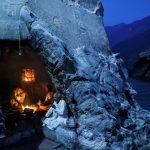 Hindu priests sit inside a cave as they perform evening prayers on the banks of the river Ganges in Devprayag, India, on March 28, 2017.