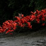 Scarlet ibis fly near the banks of a mangrove swamp located at the mouth of the Calcoene River on the coast of Amapa state, northern Brazil, on April 6, 2017.