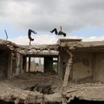 Two teens demonstrate their Parkour skills amid damaged buildings in the rebel-held city of Inkhil, west of Deraa, Syria, on April 7, 2017.