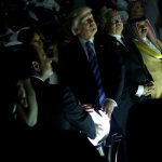 U.S. President Donald Trump and other leaders react to a wall of computer screens coming online as they tour the Global Center for Combatting Extremist Ideology in Riyadh, Saudi Arabia, on May 21, 2017.