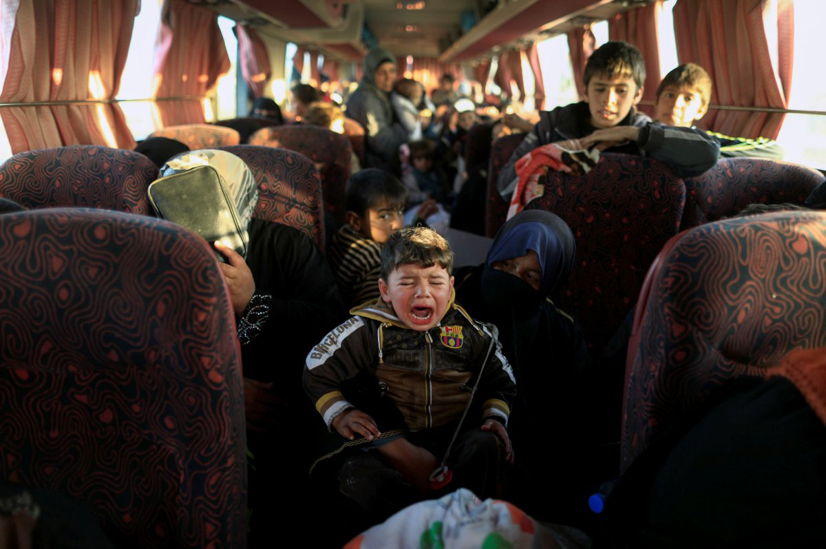 A boy who just fled a village controlled by Islamic State fighters cries as he sits with his family inside a bus before heading to the camp at Hammam Ali, south of Mosul, Iraq, on February 22, 2017.