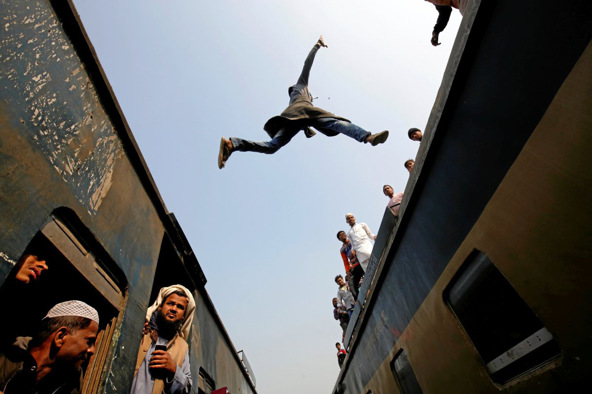 A commuter jumps between trains upon arrival at a station, to attend Akheri Munajat, the final supplication during Biswa Ijtema in Tongi, on the outskirts of Dhaka, on January 15, 2017.