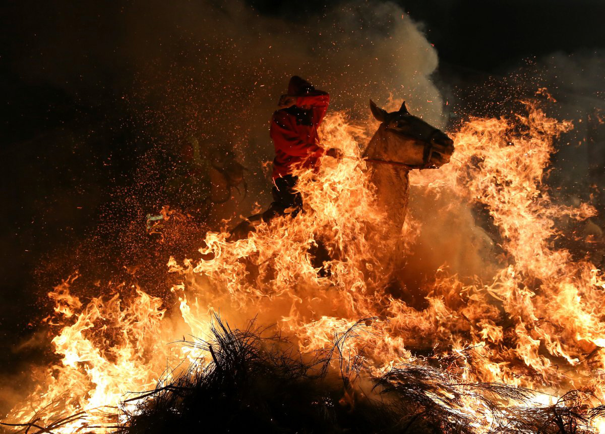 A man rides a horse through flames during the annual “Luminarias” celebration on the eve of Saint Anthony’s day, Spain’s patron saint of animals, in the village of San Bartolome de Pinares, northwest of Madrid, Spain, on January 16, 2017.