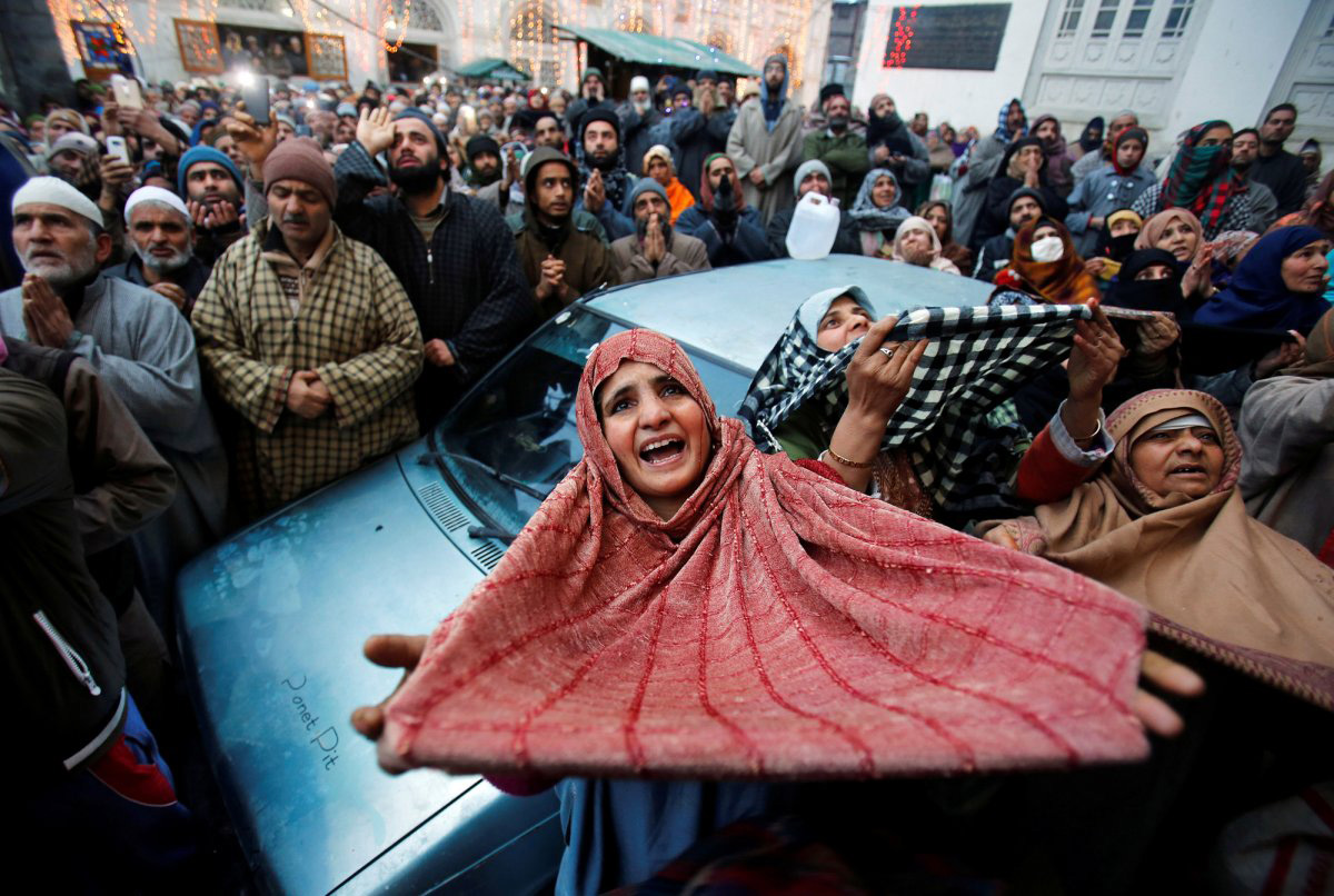 Kashmiri Muslims raise their arms upon seeing a relic of Sheikh Abdul Qadir Jilani, a Sufi saint, being displayed at his shrine on the occasion of his death anniversary, on a cold winter morning in Srinagar, on January 10, 2017.