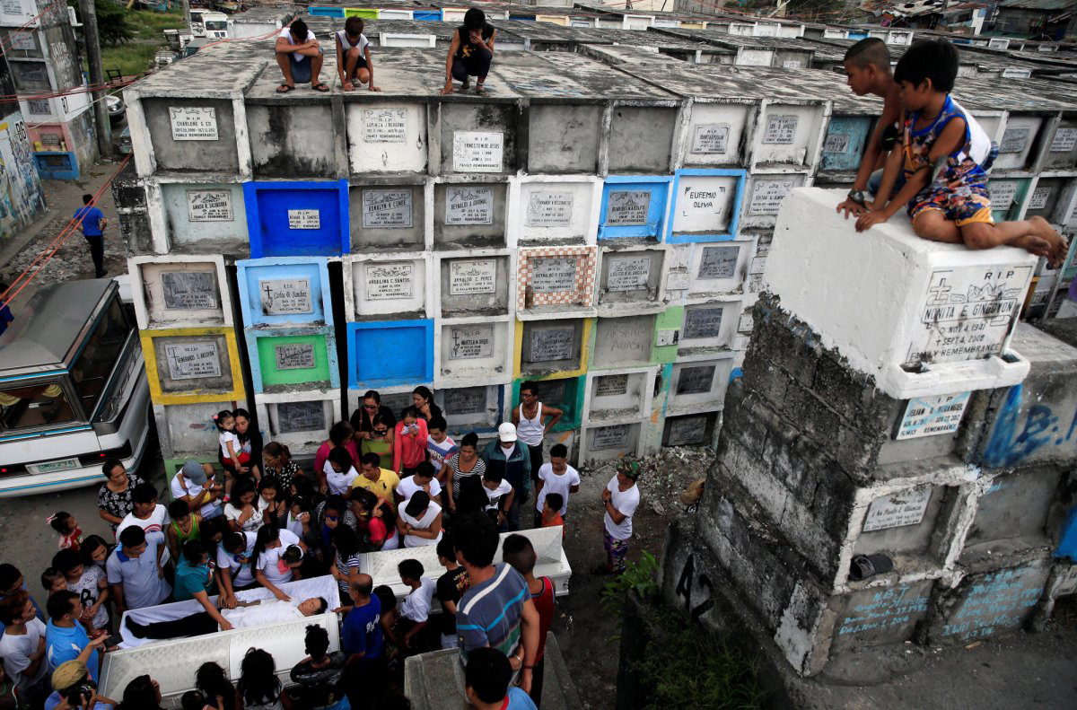 Loved ones and mourners surround the coffins of Maximo Pepito (left), 49, and his brother Marlon Pepito, 42, victims of a summary execution by unknown assailants related to the drug war, during their funeral at the Navotas cemetery, north of Metro Manila, Philippines, on January 31, 2017.