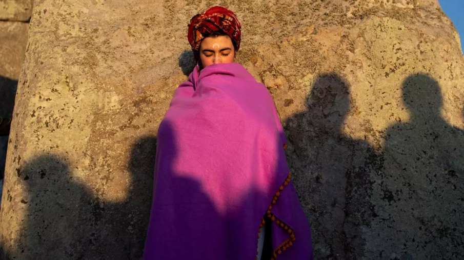 Revellers participate in the summer solstice gathering at Stonehenge, Salisbury, Britain on June 21. The annual festival attracts hundreds of people to the 5,000-year-old stone circle to mark the longest day in the northern hemisphere. Sunrise was at 4:52 a.m. local time and was celebrated by dancing, music, and ritualistic events around the stones. (Will Oliver/EPA/Shutterstock)