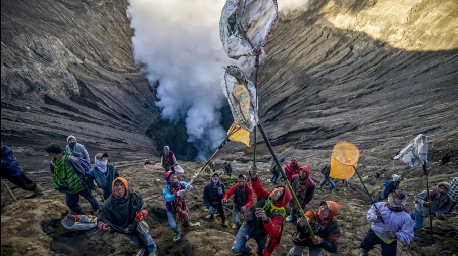 Some people prepare to catch offerings thrown by Tengger tribe people into the crater of Bromo volcano to in Probolinggo, East Java province, on June 30, as part of Yadnya Kasada festival which falls on the 14th day of the Kasada month based on the traditional Hindu lunar calendar. (Juni Kriswanto/AFP/Getty Images)