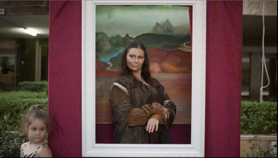 Efi Katz, The Mona Liza character, preforms during the 9th Living Statues International Festival in Rehovot, Israel on July 3. (Ariel Schalit/Associated Press)