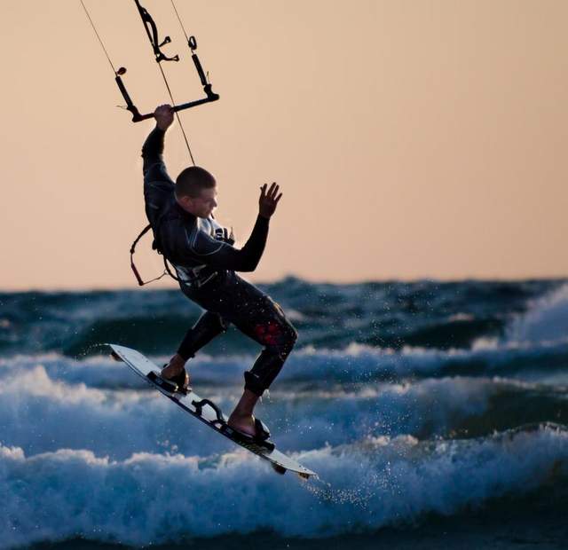 Unlike wind surfing, where a sail is attached to the board, kite surfing requires participants to hang on to an object floating as high as 75 feet above their heads.