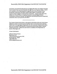 — While Baker Botts has met with committee staffers on behalf of Cayman already, the full contract — and the full $12,500 fee — doesn’t kick in until Jan. 1. Does that say something about whether Cayman expects tax reform to drag on into next year, as many tax lobbyists do? “I think predicting the pace of tax reform is beyond what foreign governments can be expected to do,” Munk said.