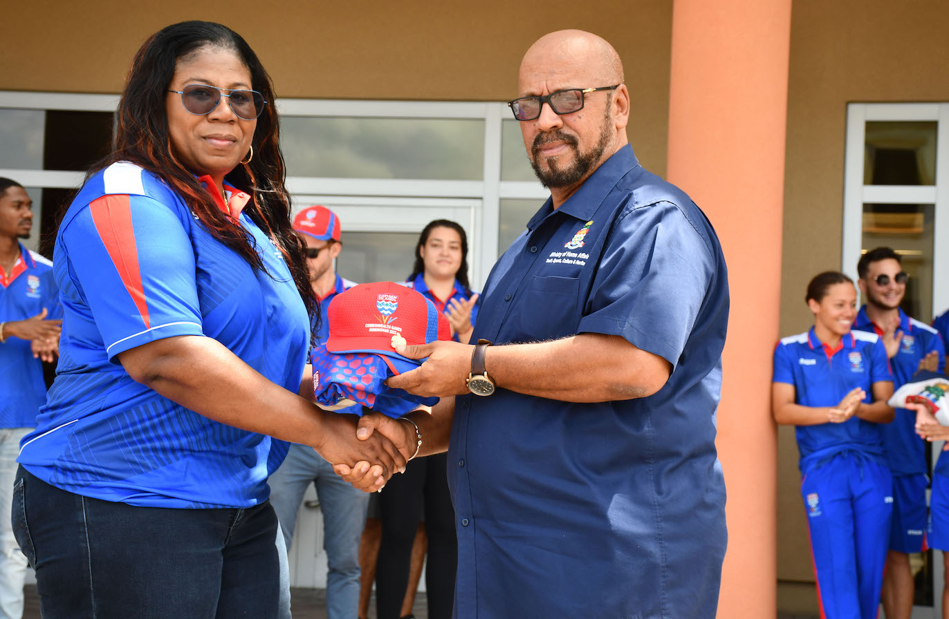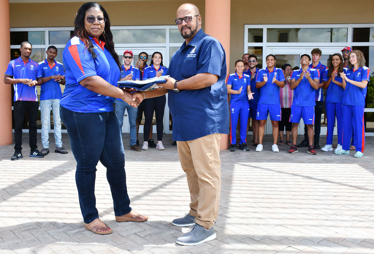 Minister Bush and Cayman Islands Olympic Committee (CIOC) Chef de Mission Janet Sairsingh exchanged the national flag, a Team Cayman shirt, cap and pin.