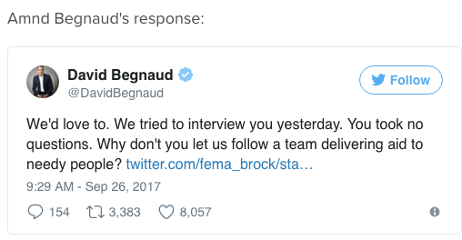 We’d love to. We tried to interview you yesterday. You took no questions. Why don’t you let us follow a team delivering aid to needy people? https://twitter.com/fema_brock/status/912464412635779074 …