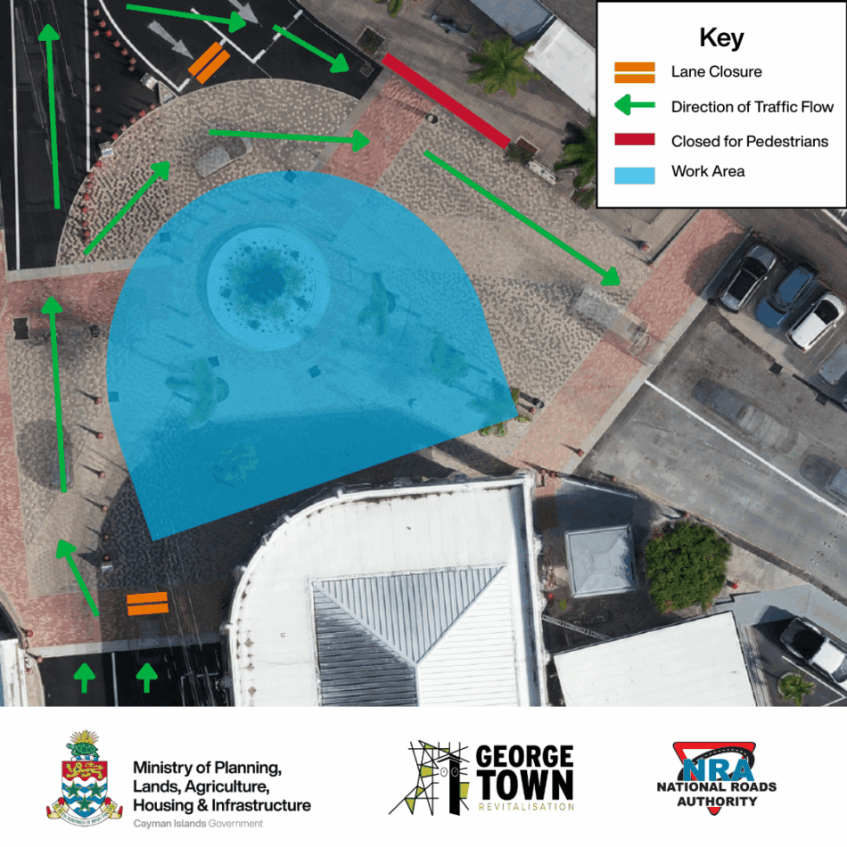 George Town, Cayman Islands – 17 October 2025 – The Ministry of Planning, Lands, Agriculture, Housing, and Infrastructure (PLAHI), along with the National Roads Authority (NRA), is advising the public of temporary lane closures in the George Town area for Robson Construction to safely and efficiently facilitate infrastructure works under the George Town Revitalisation Initiative (GTRI) – Phase 2.