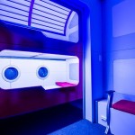 Blue lighting brings the sci-fi experience home, especially in the pod-style bunk beds.
