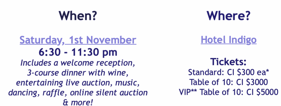 * Purchase individual tickets by 31 August to receive a special price of CI $275 per ticket. Online ticket purchases can use the code: EARLYBIRD25 to receive the CI $275 price.