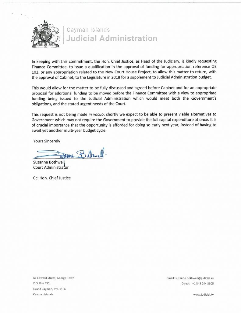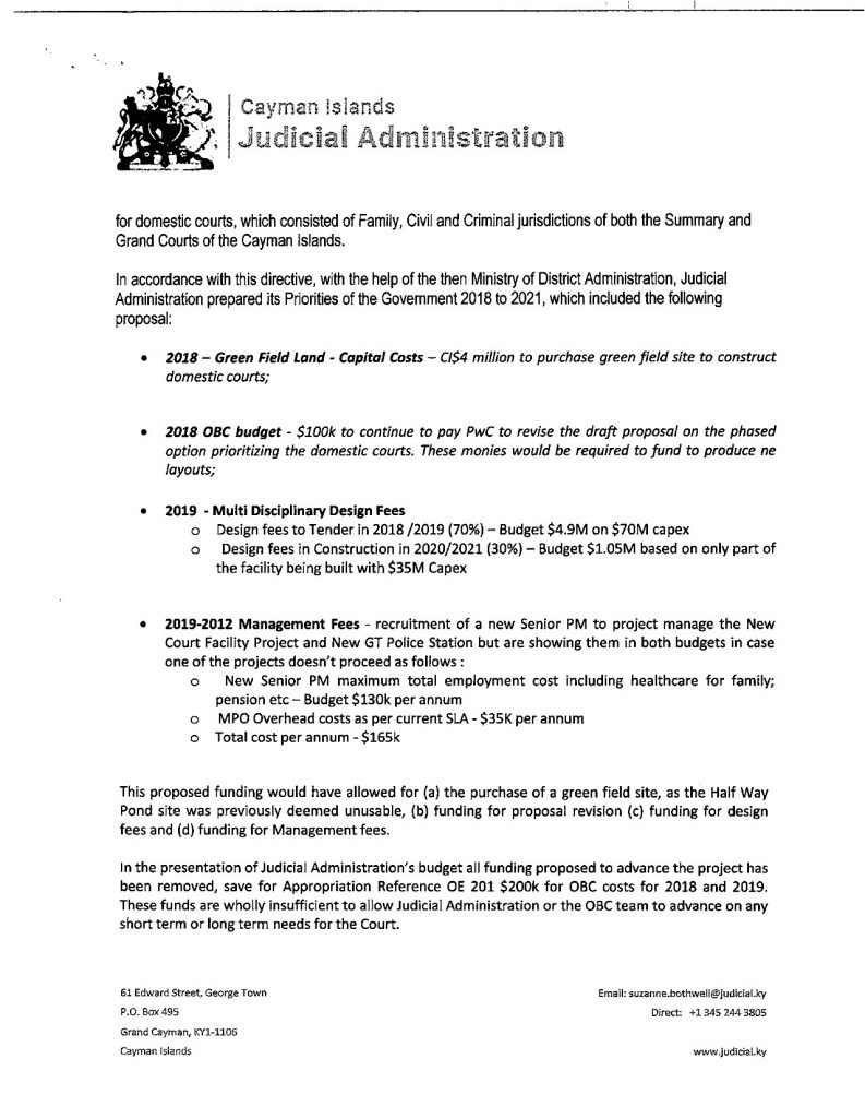 On the contrary, a sum of $4 million requested in our budget for land acquisition for the location of a building was removed without any explanation being offered. In light of the exorbitant sums estimated by PWC as the cost of any of the three proposals identified by them in 2016, our intention was to propose the development of the 2008 design on a site to be acquired within the environs of George Town. In a final bid to ensure that such a project might be progressed over the next two years, the Court Administrator wrote at my request to the Minister of Finance as chairman of the Finance Committee, asking that the position may be reserved when the budget was being debated in November last. The letter also set out the background history of the project and once more emphasized the urgent need for the building. Despite the fact that a copy of this important letter was also sent to the Hon. Premier for Cabinet’s consideration, no response has been received and no reservation to the budget was made as requested, in order to allow the matter to return to Finance Committee over the next two years.