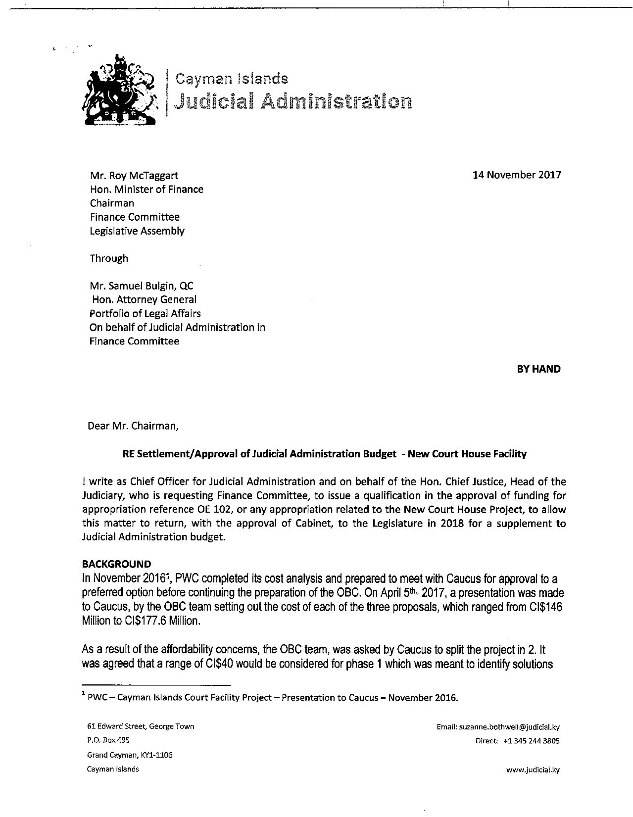 On the contrary, a sum of $4 million requested in our budget for land acquisition for the location of a building was removed without any explanation being offered. In light of the exorbitant sums estimated by PWC as the cost of any of the three proposals identified by them in 2016, our intention was to propose the development of the 2008 design on a site to be acquired within the environs of George Town. In a final bid to ensure that such a project might be progressed over the next two years, the Court Administrator wrote at my request to the Minister of Finance as chairman of the Finance Committee, asking that the position may be reserved when the budget was being debated in November last. The letter also set out the background history of the project and once more emphasized the urgent need for the building. Despite the fact that a copy of this important letter was also sent to the Hon. Premier for Cabinet’s consideration, no response has been received and no reservation to the budget was made as requested, in order to allow the matter to return to Finance Committee over the next two years.