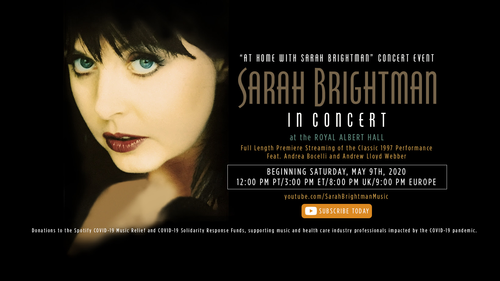 Hello Everyone … I am looking forward to you joining me for the upcoming streaming premiere of my classic 1997 “SARAH BRIGHTMAN: IN CONCERT AT THE ROYAL ALBERT HALL” full-length performance, this Saturday, May 9th, 2020. This very special event will begin streaming at 12 pm PT/3 PM ET/8 PM GMT/9 PM CET on my YouTube Channel, available for 72 hours … along with some wonderful special guests, including Andrea Bocelli, Andrew Lloyd Webber and Adam Clarke the performance will be streamed to raise funds for COVID-19 relief charities.