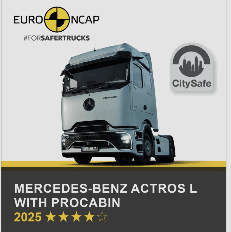 The impressive results for the Mercedes-Benz Actros models come after the company declined to take part in Euro NCAP’s inaugural test of heavy goods vehicles (HGVs) in 2024. For 2025 testing, it submitted three Actros models of differing cab heights.