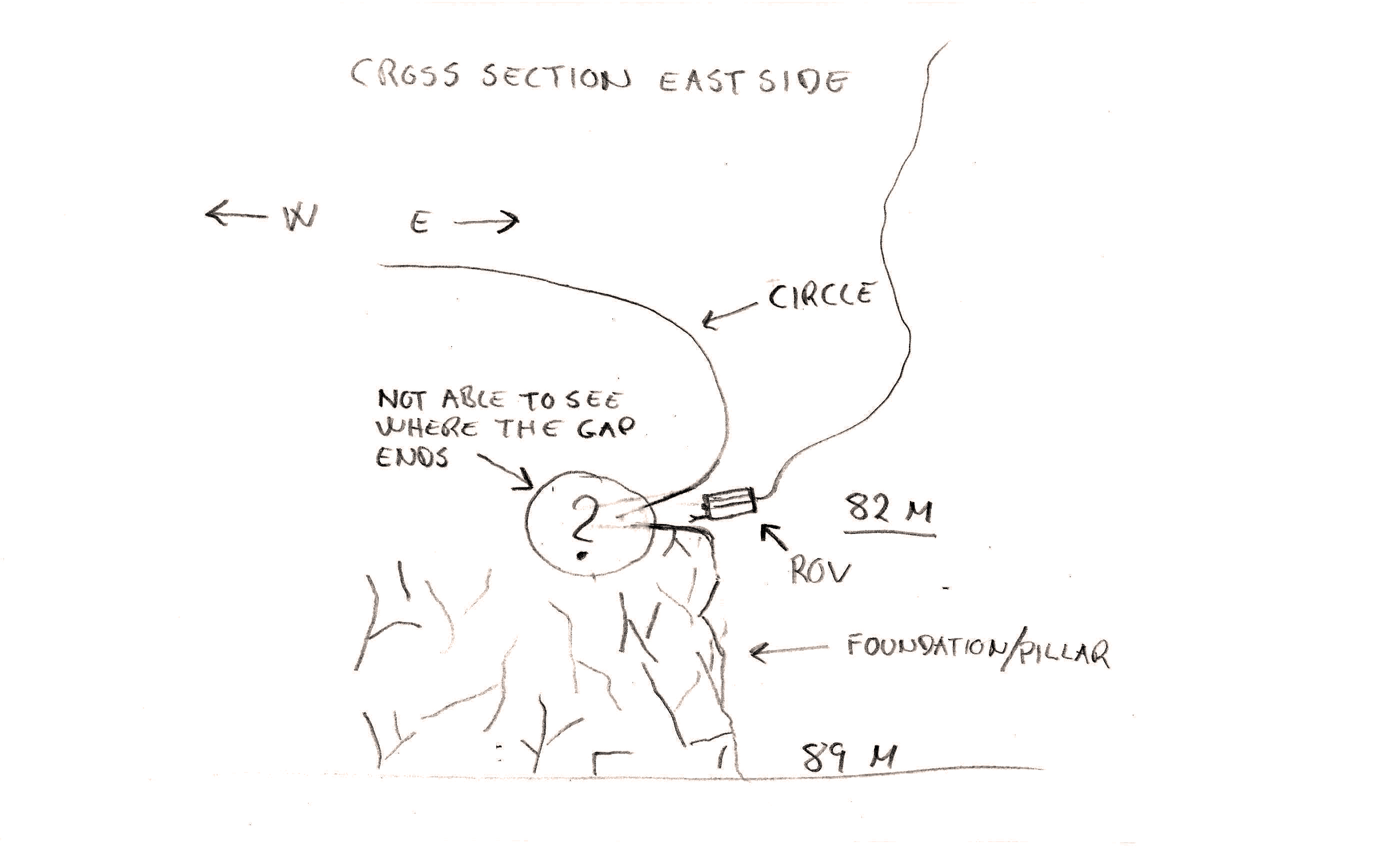 The circular object rests upon a 8 meter tall pillar/foundation. “The foundation is more that it has “popped up” like a cork or it has always been there but being partly exposed by the ice or currents. It is more of a solid cliff than bottom being pushed together to a conglomerate”- Peter LindbergThe foundation increases in thickness, to a dimension of 56 meters near the top where it meets the object. On one side of circle (front), the object is extending approximately 4-6 meters off from pillar. The object does not appear to be connected to the pillar. There is a wedge formed gap between the upper part (the circle) and the lower part (pillar foundation). Looks like granite, surface of anomaly is made of different material than pillar. “During the last expedition it was confirmed that there is a wedge formed gap between the upper part (the circle) and the lower part (foundation/pillar). However, if the two parts are completely separated or if the upper part and the lower part are the same object has not been clarified“.- Peter Lindberg (See image: http://www.oceanexplorer.se/wp-content/uploads/2012/05/image-object.jpg)90 DEGREE RIGHT ANGLES