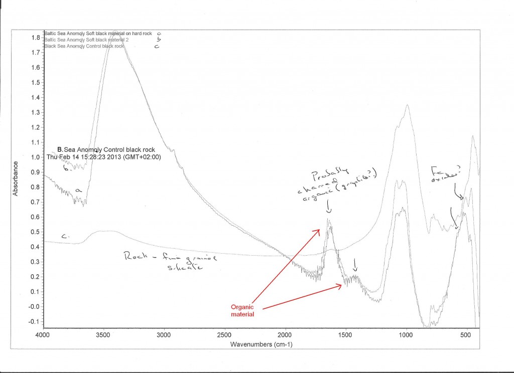 Lying on top of the object is a several strange circular formations of rocks, like “fireplaces”. They are approximately 1 meter in diameter rings of 25 – 30 hard, black “almost petrified” burnt looking stones, each stone approximately 4 inches in diameter lying side by side in a ring. These stones are covered in a black powder-like substance resembling soot. These stones were not covered in silt, which should have typically occurred on the bottom of the sea. This was thought to be strange, because other stones in the area had silt on them. (Two of these black stones were taken as samples and submitted to a lab for analysis at Stockholm University. The Team collected two stones from the area. One of the stones was apparently indigenous to the region but normally found under the Earth’s crust. The other stone was common to the mid-Atlantic. ) “It is not the same objects, the stone which appears to be a part of what looks like a ring of stones can’t be larger than a couple of fists.”- Peter Lindberg, June 20, 2012According to a video posted by Dennis on September 19th, 2012, he describes about the stones: 1st rock: Volcanic rock – Soft/possible to pick of pieces. It’s totally black inside. Apparent oxidation on it. Not magnetic. But very high density (HEAVY). Reminds him of steel (with loose rust). It has been exposed to extreme heat. Scientists say it’s highly unlikely that there’s any volcano in that area. 2nd Rock (red granite):Found on top center of the object. It’s strange… when scraping it it appears to be covered in some sort of soot (high heat again?). It’s a “normal stone” but many was found ON top of the object. Must have ended up there during ice melting “falling down). Dennis posted a video http://youtu.be/hJPJe6Kd3W4 in the Facebook group on September 19th, 2012 showing some rock samples taken which were lying on top of the object. He indicates in the video that “the object is older than 140.000 yrs. Older than that… with straight angles/lines – rounded corners… much like a “dinner plate” and separate from the base below.”