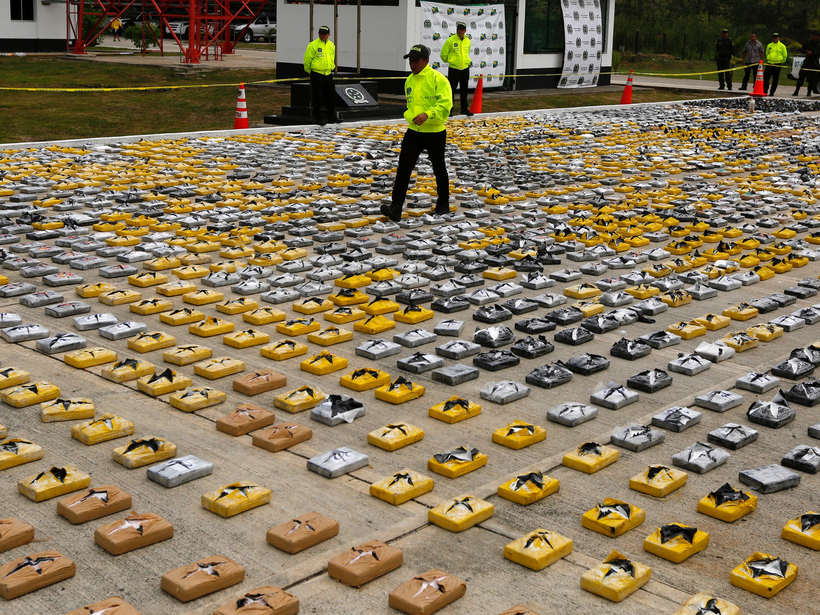Colombia cocaine Reuters/John Vizcaino A Colombian anti-narcotics policeman walks on packs of cocaine at the police base in Necocli February 24, 2015.