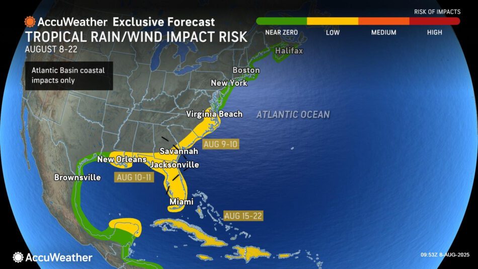 AccuWeather® hurricane experts say much of the central and eastern Gulf Coast, as well as the Atlantic coast from South Florida to the Outer Banks of North Carolina and Virginia Beach face a low risk of tropical rain and wind impacts at times through mid- to late August.