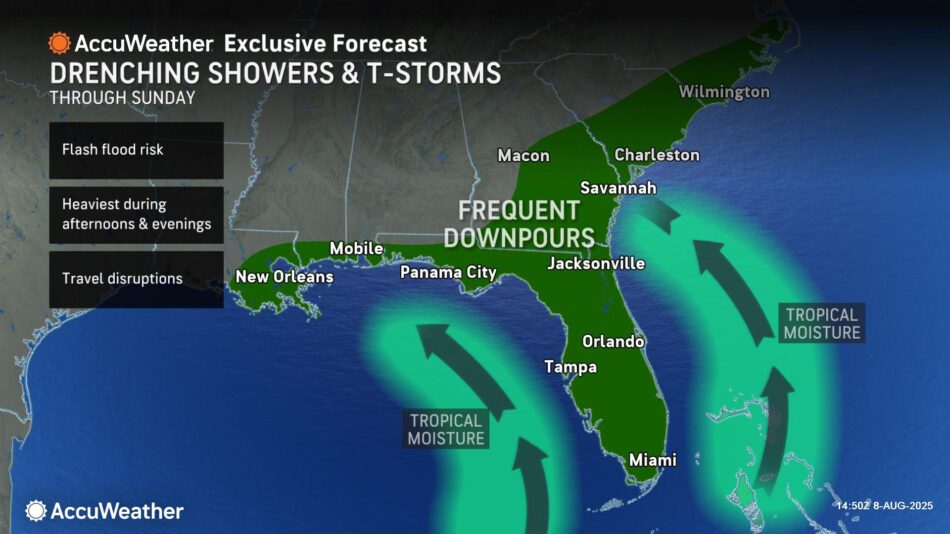 AccuWeather® expert meteorologists say a surge of tropical moisture will bring frequent downpours that could trigger flash flooding across parts of the Southeast, Florida and the central and eastern Gulf Coast through Sunday.