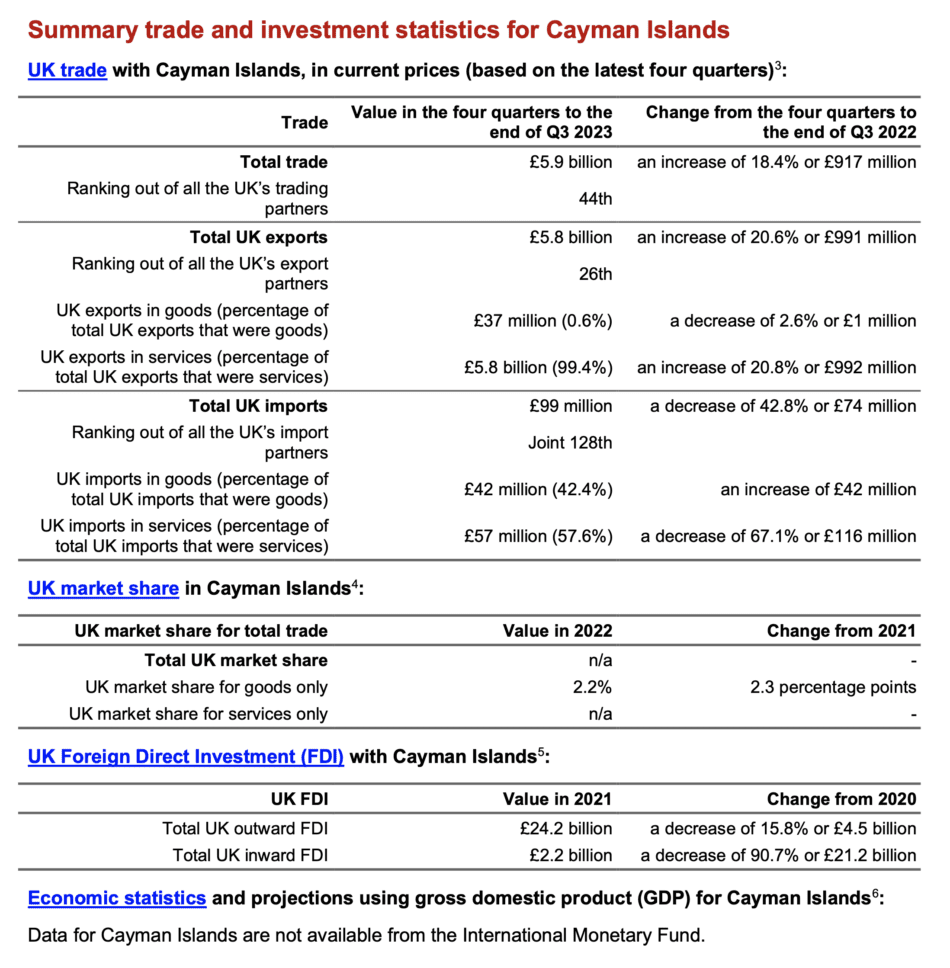 Cayman Islands was the UK’s 44th largest trading partner in the four quarters to the end of Q3 2023 accounting for 0.3% of total UK trade.1