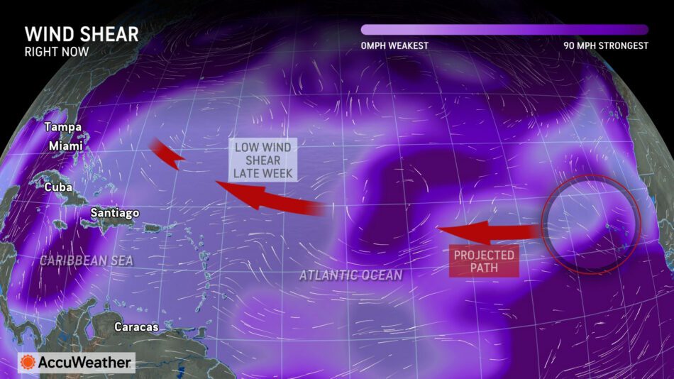 “There was a large plume of dry air and Saharan dust that pushed off the coast of Africa ahead of this tropical wave. Most of the dust is well to the northwest of Erin. We expect this storm to avoid most of the dry air and dust as it develops a core. Once a storm has a core, it can typically fend off much of the dry air as it continues to strengthen,” DaSilva said. “We’re seeing the lowest amount of wind shear in the Atlantic so far this hurricane season, which is typical heading into the middle of August. These conditions are favorable for tropical development. This storm will track through a pocket of higher wind shear before entering a large area with little disruptive shear. We expect this storm to rapidly intensify into a major hurricane north of the lower Antilles over the weekend.”