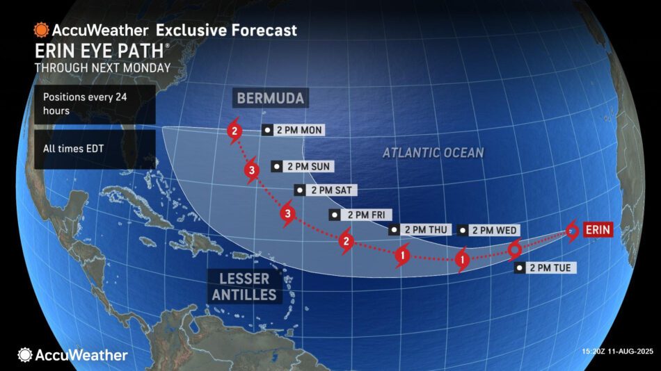 “Erin will enter an area with conducive atmospheric conditions that will allow it to quickly strengthen north of the Lesser Antilles. This storm will likely intensify into a major hurricane this weekend over an area with exceptionally warm waters and little disruptive wind shear,” AccuWeather® Lead Hurricane Expert Alex DaSilva said. “Water temperatures across much of the Atlantic main development region are plenty warm to support tropical development and even rapid intensification. Temperatures at the surface and hundreds of feet deep are higher than the historical average in many places. We are entering the time of year when ocean temperatures typically reach their warmest point of the year, between mid-August and mid-October.”