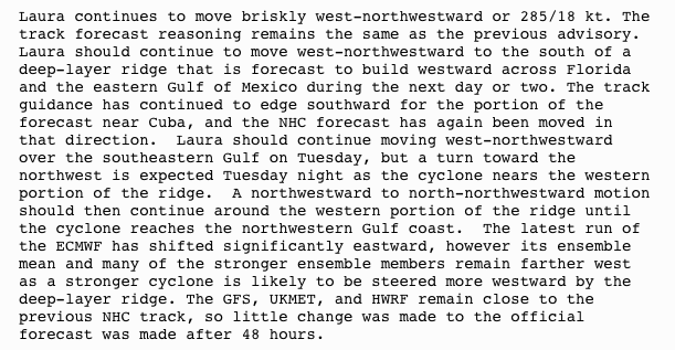 The forecast track of Laura is based on the anticipated strengthening and westward extension of the Bermuda-Azores high pressure area, which will push the storm into the central Gulf of Mexico.