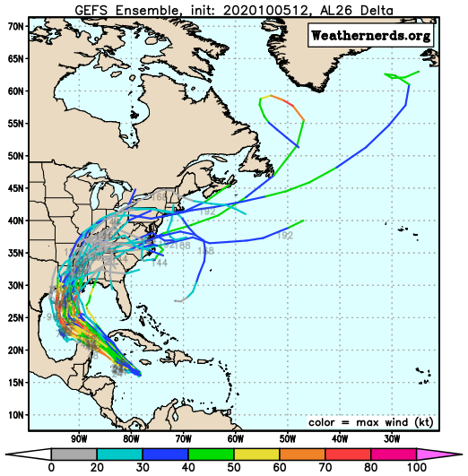 direction, and this has required the issuance of a Hurricane Warning for the northeastern portion of the Yucatan peninsula of Mexico. After 72 hours, a mid- to upper-level trough is forecast to develop over Texas which should cause Delta to turn northward and then north-northeastward toward the northern Gulf Coast. Although the track forecast has not changed much during the latter portion of the period, there is more cross-track spread in the model guidance than before, which has increased the uncertainty regarding potential landfall and the timing of Delta's approach to the northern Gulf Coast.
