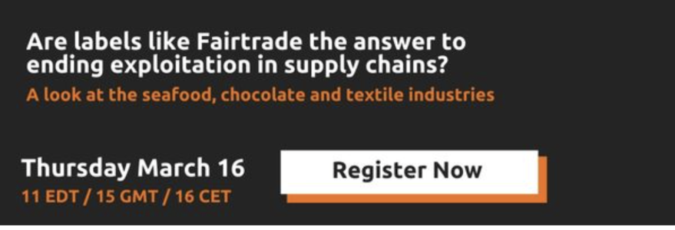 | Ever found yourself wondering if you can trust certification labels like Fairtrade, the Marine Stewardship Council or the Better Cotton Initiative to help you keep modern slavery out your shopping basket? Then this event is for you! Experts in cocoa, seafood and cotton will be discussing the role of certification schemes in tackling systemic human rights abuses and environmental damage in these sectors. Register today! |