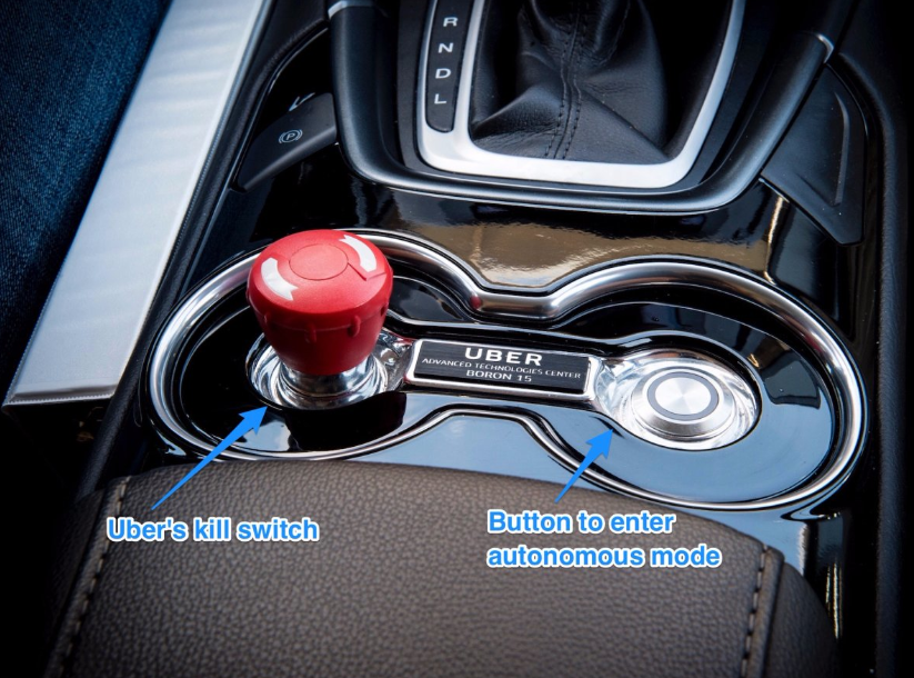 The center console is perhaps the most important part of Uber’s self-driving cars. That’s where you’ll find the button that kicks the car into autonomous mode. There’s also a very dramatic red “kill switch” that will kick the car back into manual mode.