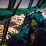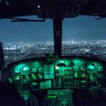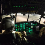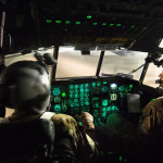 Capt. Thomas Bernard, a 36th Airlift Squadron C-130 Hercules pilot, performs a visual confirmation with night vision goggles during a training mission over the Kanto Plain, Japan, Oct. 14, 2015.