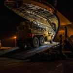 Staff Sgt. Robert Clark directs anArmy M142 High Mobility Artillery Rocket System out of a C-17 Globemaster III, April 25 during Exercise Emerald Warrior, at Hurlburt Field, Fla.