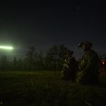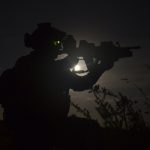 A special operations Airman aims his weapon to designate the location of a threat Oct. 9, 2014, during a training mission at Stanford Training Area near Thetford, England.
