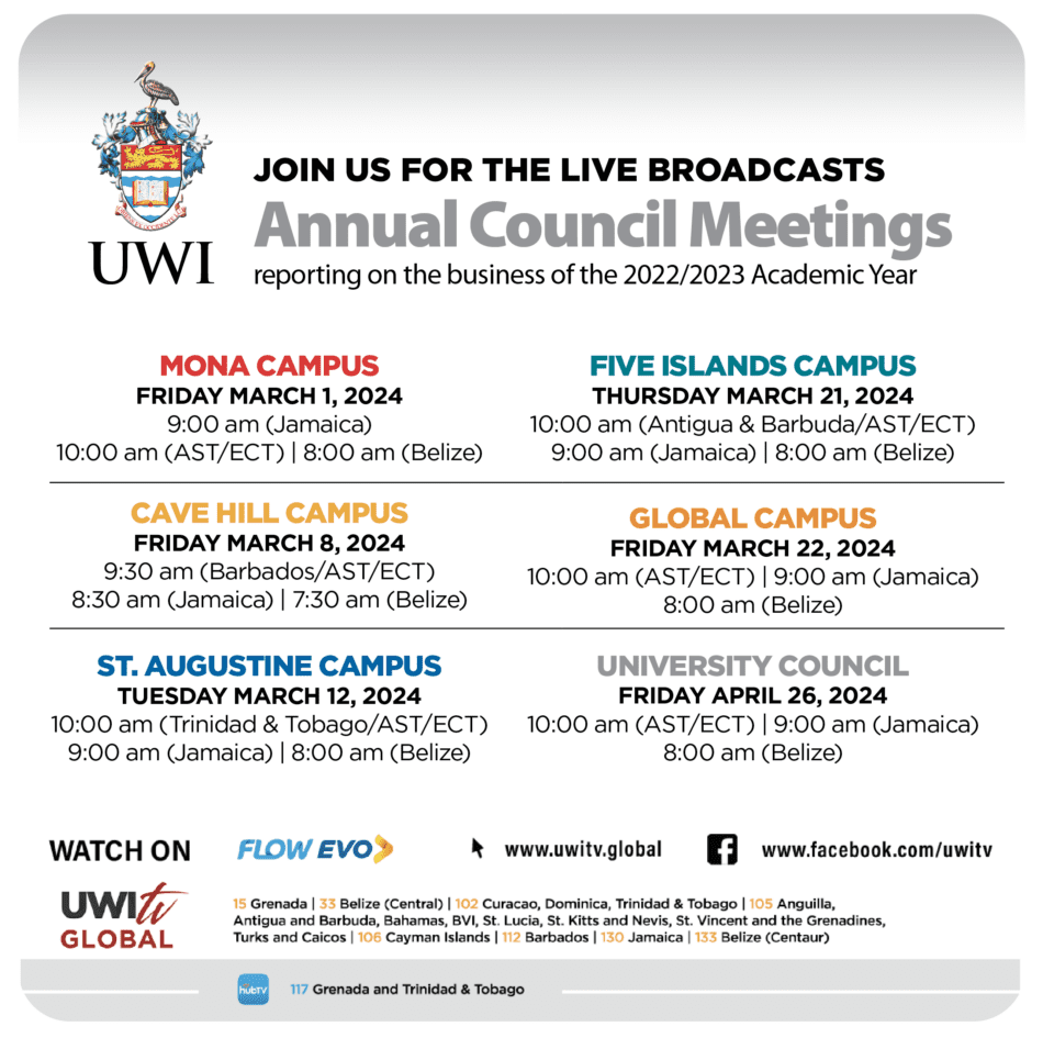 § Live broadcast via www.uwitv.global, www.facebook.com/uwitv and on UWItv’s Flow and HubTV cable channels