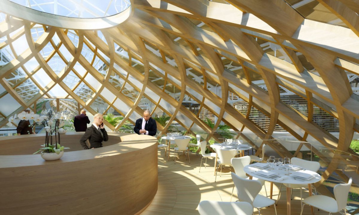 The greenery would continue indoors. Here’s what one of the building’s grand lobby would look like.
