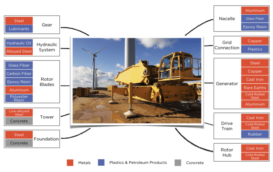 Materials required in the manufacturing and operation of a wind turbine. Source – Till Zimmermann, Max Rehberger, and Stefan Gößling-Reisemann, Material Flows Resulting from Large Scale Deployment of Wind Energy in Germany.png