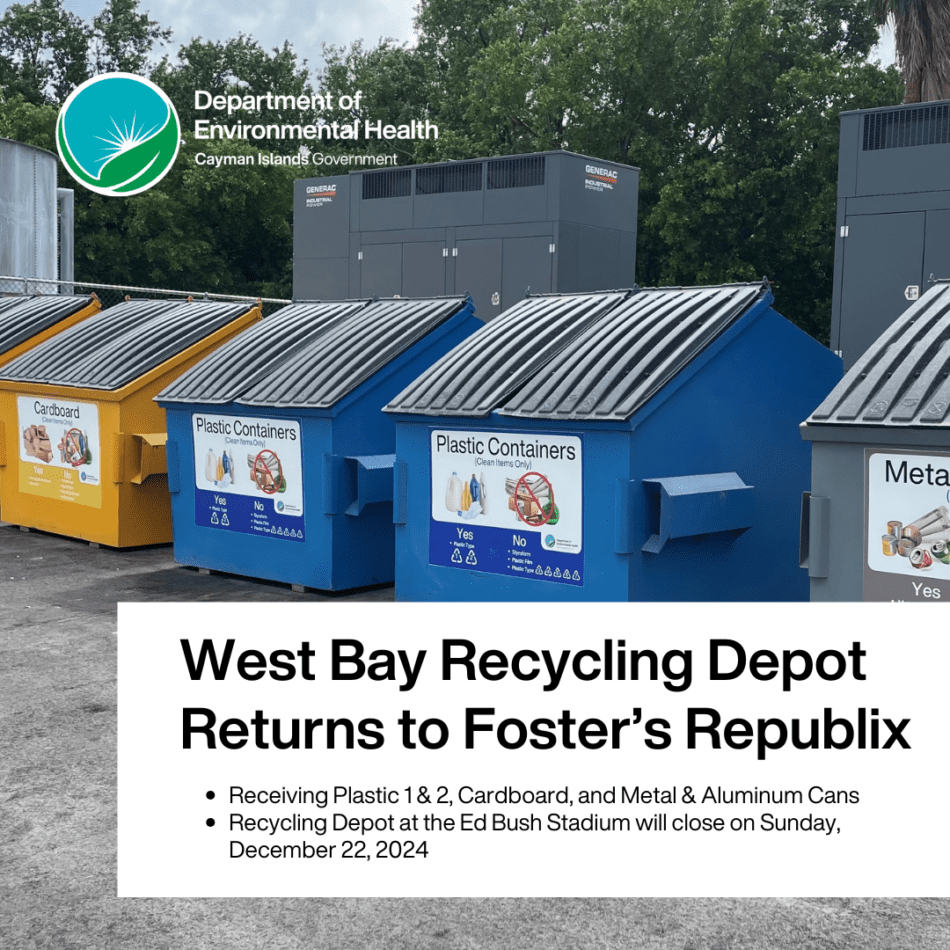 Grand Cayman, 13 December, 2024 – The Department of Environmental Health (DEH) is announcing the relocation of its West Bay Recycling Depot back to Foster’s Republix and the closure of the Recycling Depot located at the Ed Bush Stadium.