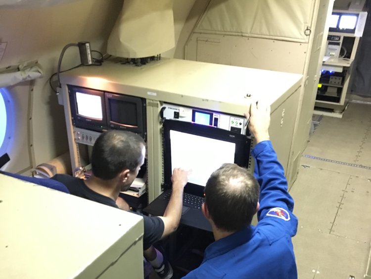 Zawislak and a colleague examine the flight track and check data coming in from their instruments in flight. Jon Zawislak
