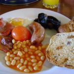A typical English breakfast includes fried eggs, sausage, bacon, and beans.