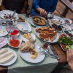 The variety in a Turkish breakfast is impressive. There’s bread, cheese, butter, olives, eggs, tomatoes, cucumbers, jam, honey, and kaymak. The meal can also include sucuk, a spicy Turkish sausage, and Turkish tea.
