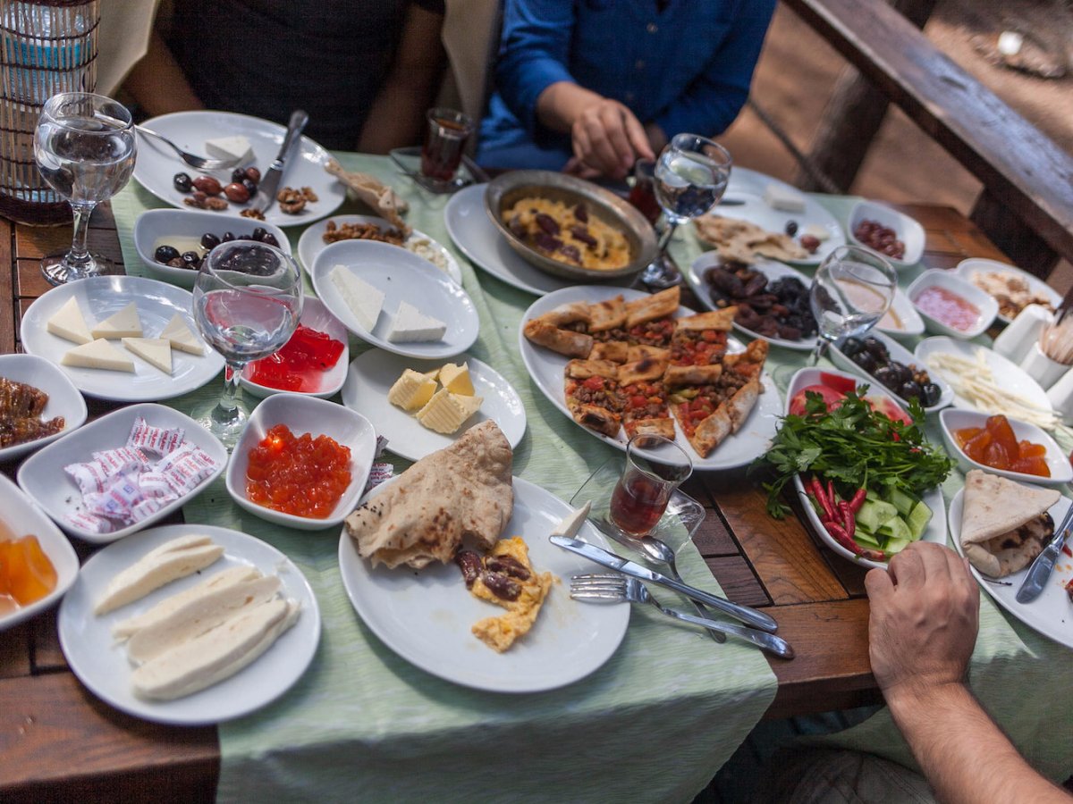 The variety in a Turkish breakfast is impressive. There’s bread, cheese, butter, olives, eggs, tomatoes, cucumbers, jam, honey, and kaymak. The meal can also include sucuk, a spicy Turkish sausage, and Turkish tea.