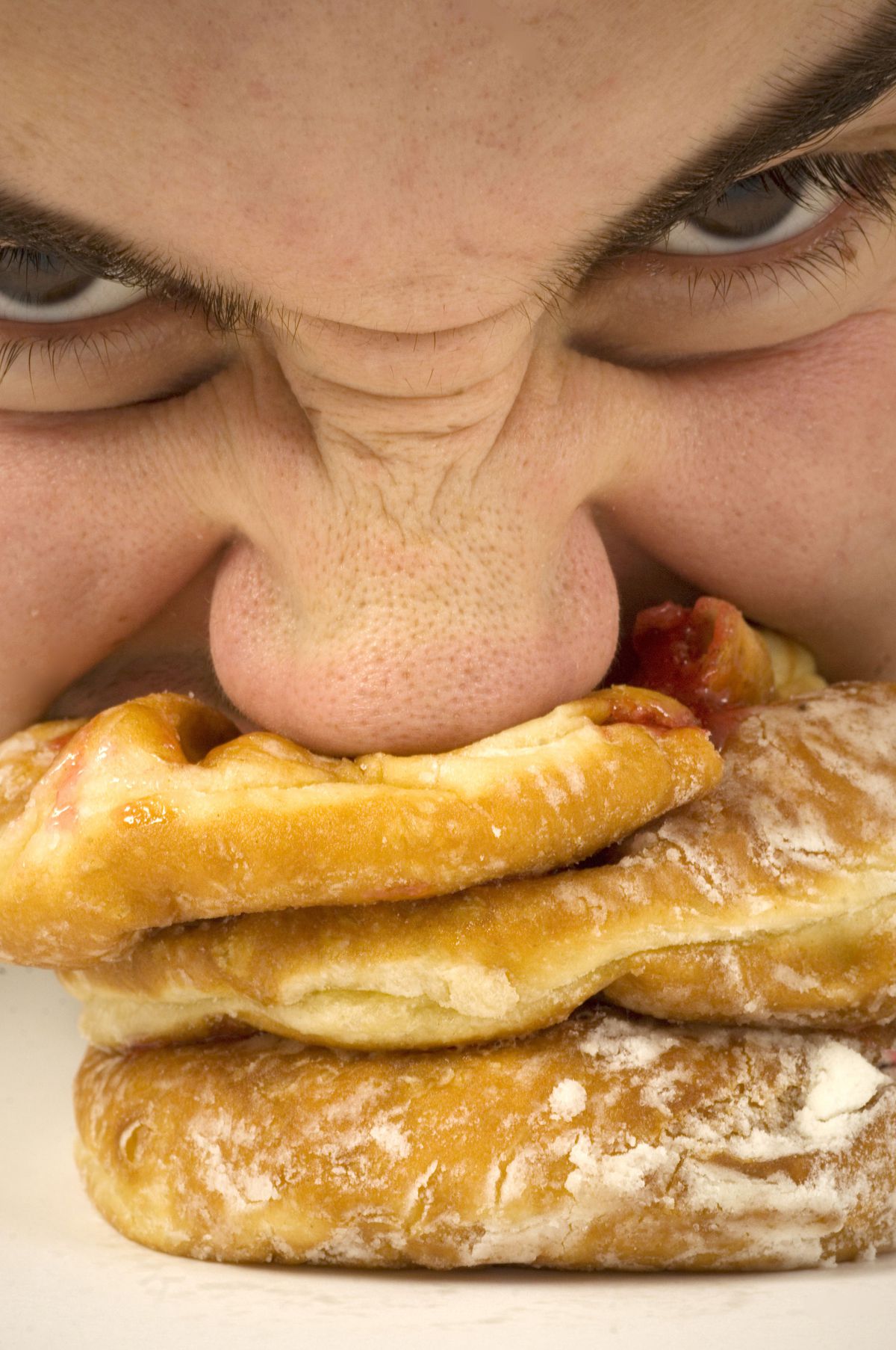 Mandatory Credit: Photo by Medicimage/REX/Shutterstock (4134190a) Model Released – A young male eating several jam doughnuts VARIOUS