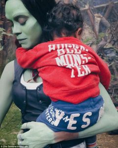 She shared a photo on Instagram of her as her character Gamora as she cuddled one of her twin boys.